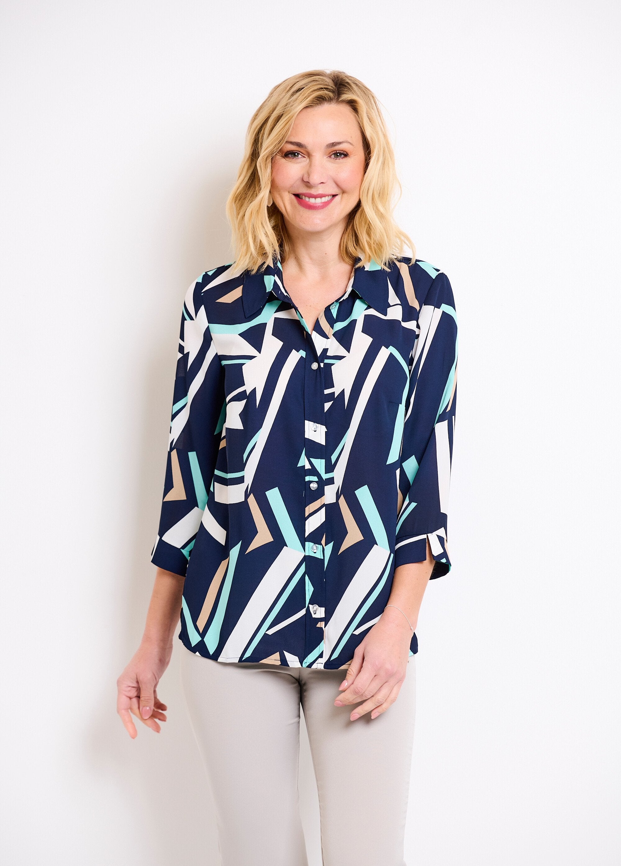 Straight graphic blouse with 3/4 sleeves  Navy and beige