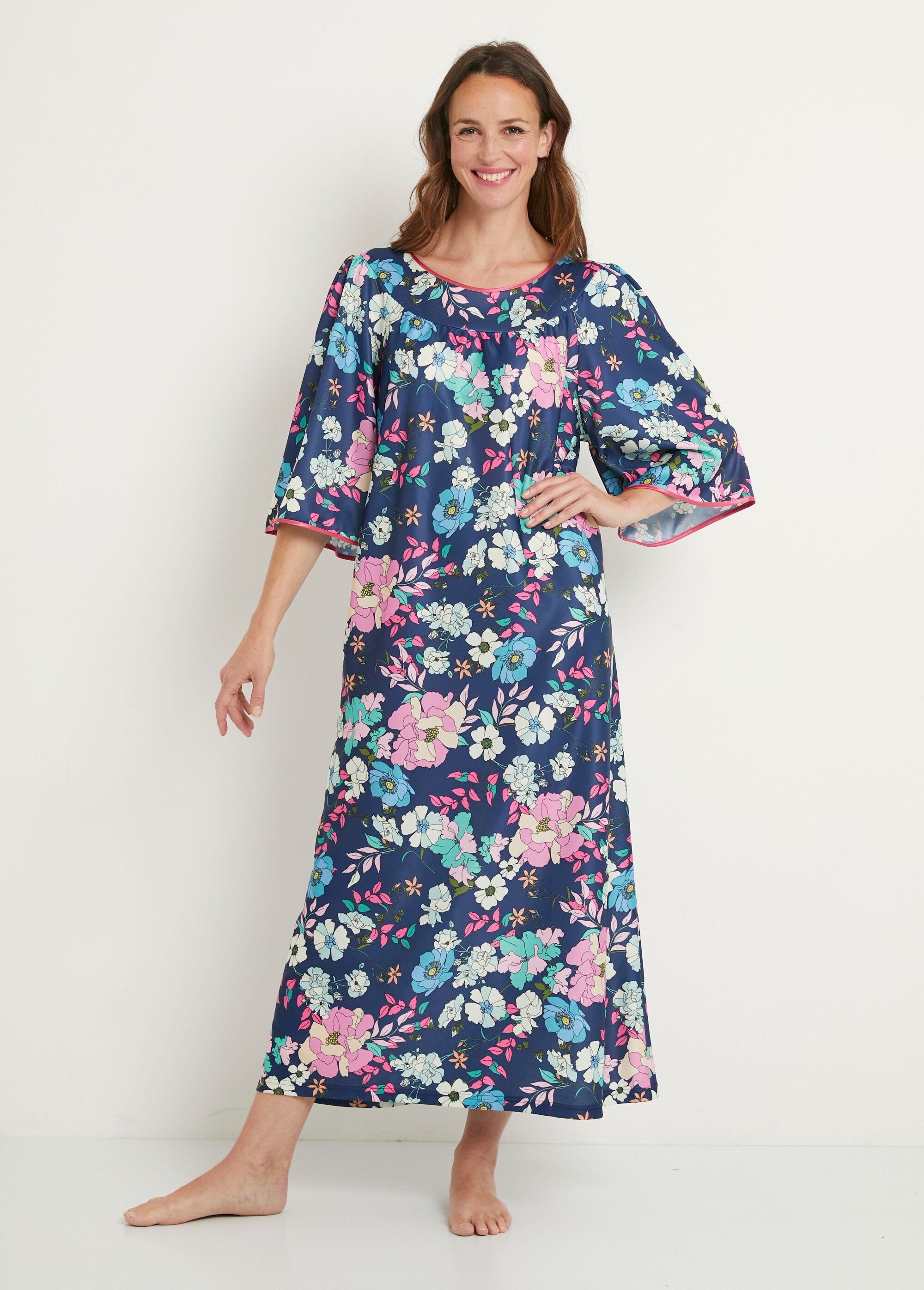 Floral and airy, the women's hostess dress wraps the silhouette in satiny fluidity. With the seduction and comfort of an ample, softly gathered line under the front yokes. Satin bias on scoop neck and elbow-length sleeves. Straight base.