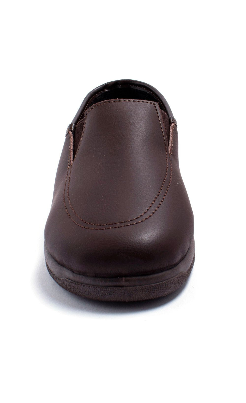 Looks, comfort and a low price on the agenda for this moccasin-style slip-on. Fully stitched split leather upper (cowhide). Well-fitting shape with elasticated sides for comfort and easy donning. Rear buttress. French made.