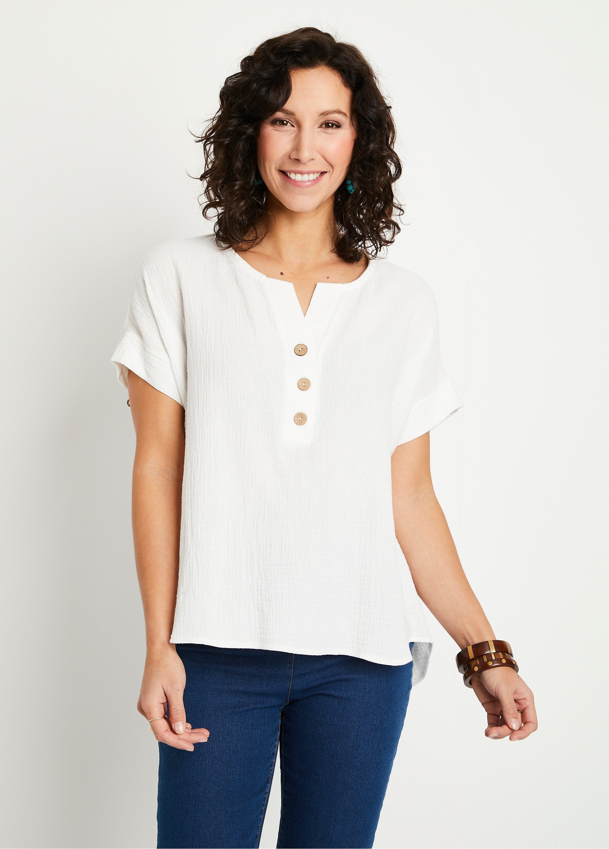 The long and loose line tunic. Open rounded V-neckline crossed with a small button placket. Insert at the bottom of the short kimono sleeves. Wide pleat under middle back yoke for ease. Rounded base. French made.